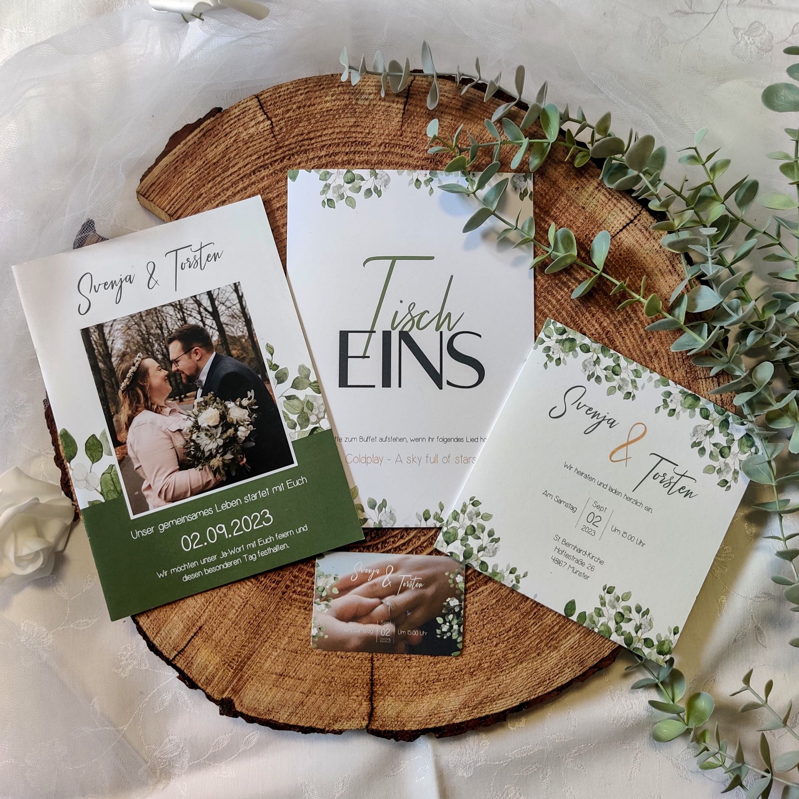 • Hochzeitsdrucke wie Einladungen, Save-the-Date-Karten, Dankeskarten und Menükarten